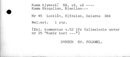 //// Kumm kjynesäf Sä, sä, sä ---- //// ^ Kumm Skogalinn, Rienlinn--- //// Nr 45 Locklåt, Elfdalen, Dalarna Dbk //// i Mel.not. 1 str. //// Ät'* ^ //// (Enl. kommentar s.52 jfr Vallmelodin under //// nr 25 "Kumir bort ---") //// DYBECK SV. FOLKMEL. ////