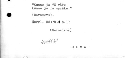 //// "Kunne ja få råke //// kunne ja få språke." //// ^ (Barnvers). //// Norrl. 88:75,t s.17 //// (Barnvisor) //// j //// U L M Å ////