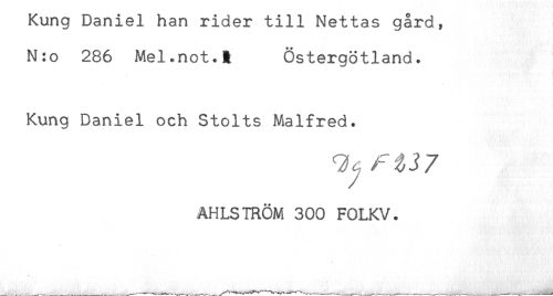 //// nung Daniel han rider till Nettas gard, //// N:o 286 Mel.not.å Östergötland. //// Kung Daniel och Stolts Malfred. //// AHLSTRÖM 300 FOLKV. ////