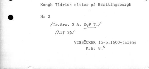 //// Kongn lidrick sitter pabarttingsborgn //// /Tr.Årw. 3 A. DgF 7./ //// /Älf 36/ //// VISBÖCKER 15-o.l600-talens //// K.B. 8:° //// !_____ _ _ /** ',_ ////