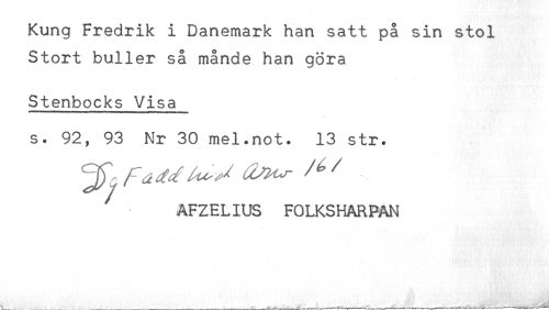 //// Kung Fredrik i Danemark han satt på sin stol //// Stort buller så månde han göra //// Stenbocks Visa //// s. 92, 93 Nr 30 mel.not. 13 str. //// ^ AFZELIUS FOLKSHARPAN //// (A. . - ^ t , - r- - V' ' __ //// _____ _ _ ___ _____—___- ---—-—,----—---———---——----— ////