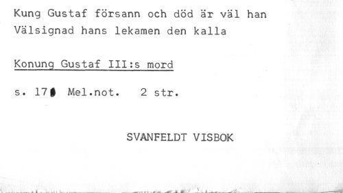//// Kung bustaf iorsann och dod ar val han //// Välsignad hans lekamen den kalla //// Konung Gustaf III:s mord //// s. 17$ Mel.not. 2 str. //// SVANFELDT VISBOK ////