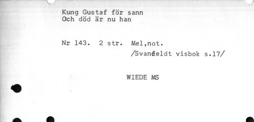 //// Kung Gustaf för sann //// Och död är nu han //// Nr 143. 2 str. Mel,not. //// /Svanéeldt visbok s.17/ //// WIEDE MS ////