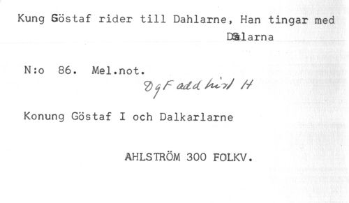 //// Kung Söstaf rider till Dahlarne, Han tingar med //// Dä la ma //// N:o 86. Mel.not. //// Konung Göstaf I och Dalkarlarne //// AHLSTRÖM 300 FOLKV. ////