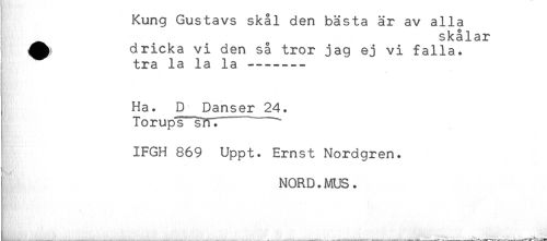 //// Kung Gustavs skål den bästa är av alla //// skålar //// ! dricka vi den så tror jag ej vi falla. //// tra la la la ------- //// Ha. D Danser 24. //// Torups srl.' *** //// IFGH 869 Uppt. Ernst Nordgren. //// j NORD.MUS. ////