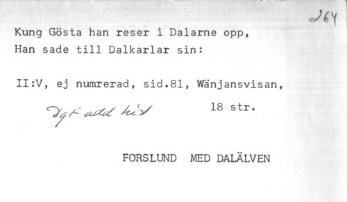//// ------ — . - -, //// Kung Gösta han reser i Dalarne opp, //// Han sade till Dalkarlar sin: //// II:V, ej numrerad, sid.81, Wänjansvisan, //// str. //// FORSLUND MED DALÄLVEN ////