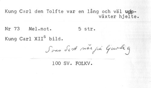 //// Kung Carl den Tolfte var en lång och väl upp- //// växter hjelte. //// Nr 73 Mel.not. 5 str. //// Kung Carl XII^ bild. //// 100 SV. FOLKV. ////