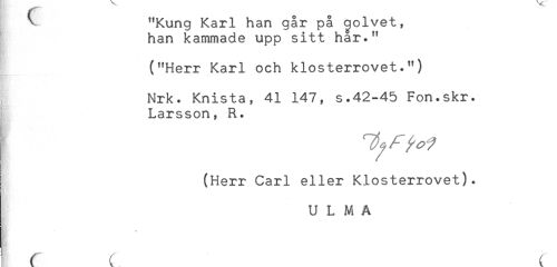 //// ^ "Kung Karl han går på golvet, //// han kammade upp sitt har." //// ("Herr Karl och klosterrovet.") //// Nrk. Knista, 41 147, s.42-45 Fon.skr. //// Larsson, R. //// (Herr Carl eller Klosterrovet). //// ULMA ////