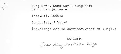 //// ^ Kung Karl, Kung Karl, Kung Karl //// den unga hjälten - //// insp.Rtj. 8868:2 //// Lundqvist, J.Ystad //// (bevärings och soldatvisor,visor om kungl.) //// RA INSP. ////