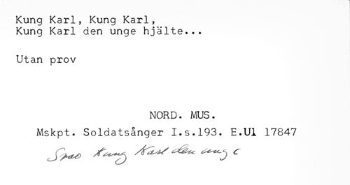 //// Kung Karl, Kung Karl, //// Kung Karl den unge hjälte... //// Utan prov //// NORD. MUS. //// Mskpt. Soldatsånger I.s.193. E.U1 17847 ////