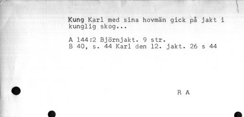 //// Kung Karl med sina hovmän gick på jakt i //// kunglig skog... //// A 144:2 Björnjakt. 9 str. //// B 40, s. 44 Karl den 12. jakt. 26 s 44 //// Knyn-' i. ////