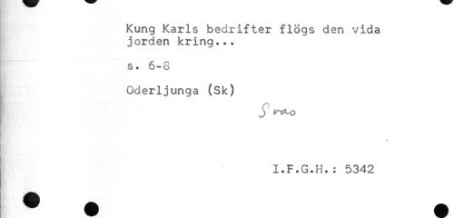//// Kung Karls bedrifter flögs den vida //// jorden kring... //// s. 6-8 //// . //// * //// Oderljunga (Sk) //// . //// I.F.G.H.: 5342 ////