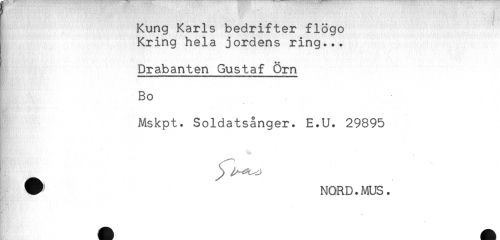 //// i Kung Karls bedrifter flögo //// j Kring hela jordens ring... //// Drabanten Gustaf Örn //// "I... ' ------- ' - - H.H IX) n . .) //// K - //// Bo //// Mskpt. Soldatsånger. E.U. 29895 //// # NORD.MUS. ////