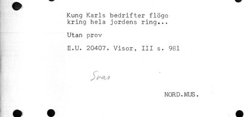 //// Kung Karls bedrifter flogo //// kring hela jordens ring... //// Utan prov //// E.U. 20407. Visor, III s. 981 //// . //// NORD. MUS. ////