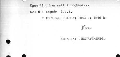 //// K^ng Ring han satt i högbänk... //// Se: K F Tegnér l,o,t, //// E 1832 yy; 1840 a; 1843 k; 1846 h, //// i,'',, //// M //// KB:s SKILLINGTRYCKSREG. ////