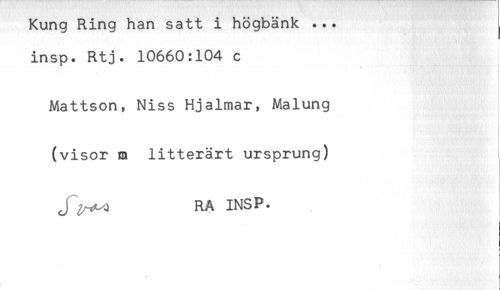 //// Kung Ring han satt i högbänk ..* //// insp. Rtj. 10660:104 c //// < //// Mattson, Niss Hjalmar, Malung //// (visor m litterärt ursprung) //// J ^^ RA INSP. ////