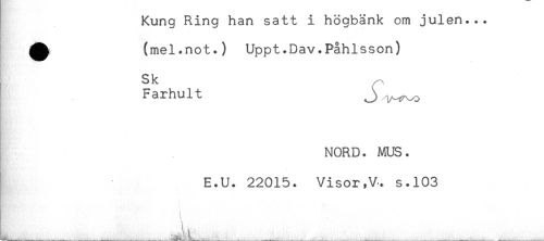 //// Kung Ring han satt i högbänk om julen... //// ^ (mel.not.) Uppt.Dav.Påhlsson) //// Sk //// Farhult //// Ef § ^ //// NORD. MUS. //// E.U. 22015. Visor,V. s.103 //// ! , //// s //// ! ' //// ^..... ....., . _____ ////