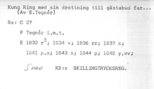 //// Kunq Ring med sin drottning till gästabud far... //// (Av E.Tegnér) //// Se: C 27 //// F Tegnér i,m,t, //// E 1832 r^; 1834 v; 1836 rr; 1837 c; //// 1841 p,x; 1843 s; 1844 p; 1848 y,vv; //// KB:s SKILLINGTRYCKSREG. ////