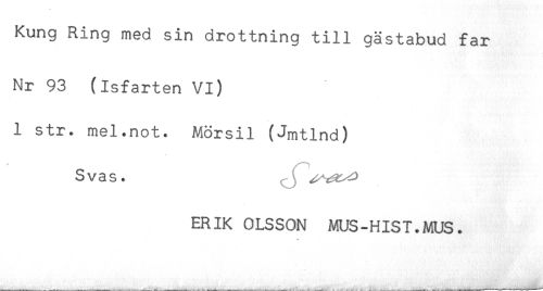 //// Kung Ring med sin drottning till gästabud far //// Nr 93 (Isfarten VI) //// 1 str. mel.not. Mörsil (Jmtlnd) //// Svas. //// ERIK OLSSON MUS-HIST.MUS. ////