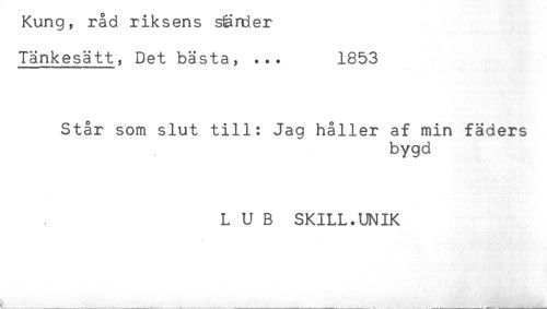 //// Kung, rad riksens sänder //// Tänkesätt, Det bästa, ... 1853 //// Står som slut till: Jag håller af min fäders //// bygd //// L U B SKILL.UNIK ////