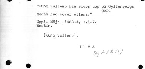 //// "Kung Vallemo han rider upp på Gyllenborgs //// gård //// medan jag sover allena." //// Uppl. Möja, 1483:4, s.1-7. //// Westin. //// (Kung Vallemo). //// ULMA ////