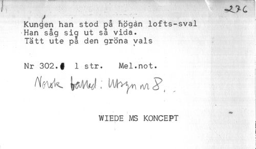 //// i //// Kunden han stod pa hpgän lofts-sval //// Han såg si^ ut så vida. //// Tätt ute pa den gröna vals //// Nr 302.$ 1 str. Mel.not. //// WIEDE MS KONCEPT ////