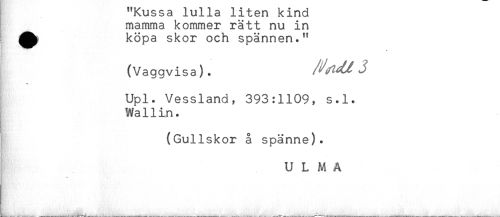 //// åxuat 3- <3 JL U JL JL Cl JL JL Ut? i i K. JU iU //// mamma kommer rätt nu in //// ^ köpa skor och spännen." //// * //// (Vaggvisa). //// Upl. Vessland, 393:1109, s.l. //// Wallin. //// (Guliskor å spänne). //// ULMA ////