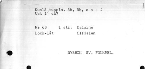 //// . .. . - . * . ; ^ , . //// Kuolå-tuppin, åh, åh, o a - ^ //// Uat i' da? //// Nr 63 1 str. Dalarne //// * //// Lock-låt Elfdalen //// * //// BYBECK SV. FOLKMEL. //// . ////