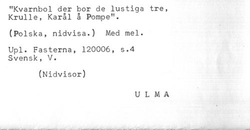 //// "Rvarnaoi aer nor ae ius*uiga tre, //// Krulle, Karål å Pompe". //// (Polska, nidvisa.) Med mel. //// Upl. Fastema, 120006, s<4 //// Svensk, V. //// (Nidvisor) //// U L M A ////
