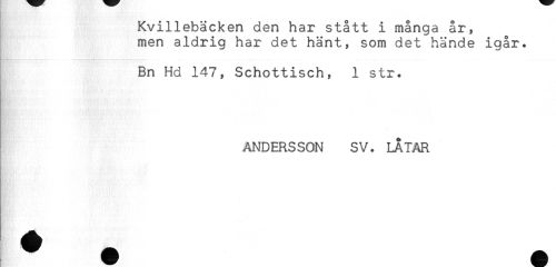 //// Kvillebäcken den har stått i många år, //// men aldrig har det hänt, som det hände igår. //// Bn Hd 147, Schottisch, 1 str. //// ANDERSSON SV. LÅTAR ////