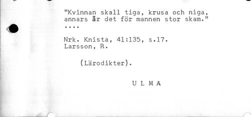 //// "Kvinnan skall tiga, krusa och niga, //// annars år det för mannen stor skam." //// Nrk. Knista, 41:135, s.17. //// Larsson, R. //// & s //// K' ' //// (Lärodikter). //// ULMA //// _ ////