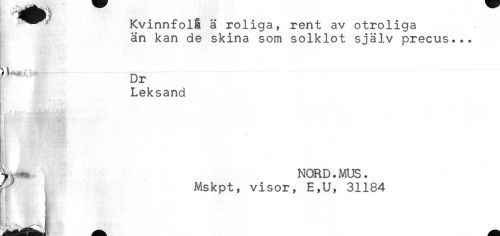 //// * ' Kvinnfolå ä roliga, rent av otroliga //// än kan de skina som solklot själv precus... //// [. ? //// ^ Dr //// Leksand //// - - .i;' " \ -^-"t,-' -"v //// ^ ^ NORD.MUS. //// ^ Mskpt, visor, E,U, 31184 ////