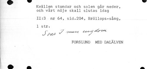 //// Kvällen stundar och solen går neder, //// och vårt nöje skall slutas idag //// 11:3 nr 64, sid.204, Bröllops-sång, //// 1 str. //// FORS LUND MED DALÄLVEN //// * //// f //// ' t ////