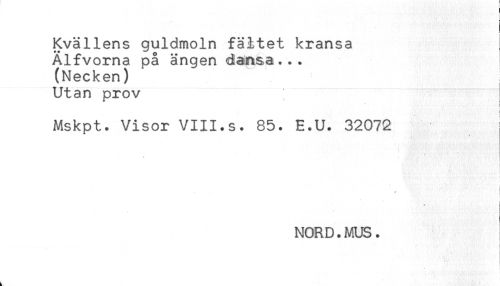 //// ' //// Kvällens guldmoln fältet kransa //// Älfvorna på ängen dansa... //// (Necken) //// Utan prov //// Mskpt. Visor VIII.s. 85. E.U. 32072 //// \ //// * //// ''' ////