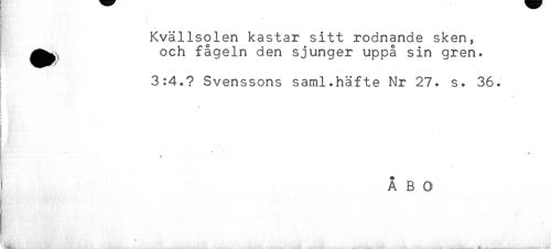 //// } //// Kvällsolen kastar sitt rodnande sken, //// och fågeln den sjunger uppå sin gren. //// 3:4.? Svenssons saml.häfte Nr 27. s. 36. //// . //// * //// ! ÅBO //// //// /