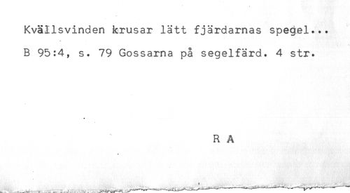 //// Kvällsvinden krusar lätt fjärdarnas spegel... //// * //// B 95:4, s. 79 Gossarna på segelfärd. 4 str. //// * //// R A //// * //// ' r.rl^^^* ..-. t), ----.......^ ////