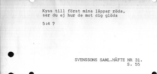 //// k' . * //// Kyss till först mina läppar röda, //// ser du ej hur de mot dig glöda //// 5:4 ? //// ^ SVENSSONS SAML.HÄFTE NR 31. //// S. 55 ////