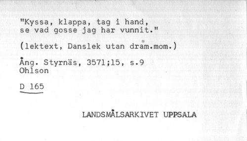 //// "Kyssa, klappa, tag i hand, //// se vad gosse jag har vunnit." //// ! //// . //// (lektext, Danslek utan dram.mom.) //// Ang. Styrnäs, 3571;15, s.9 //// Ohlson //// D^ 165 //// LANDSMALSARKIVET UPPSALA ////