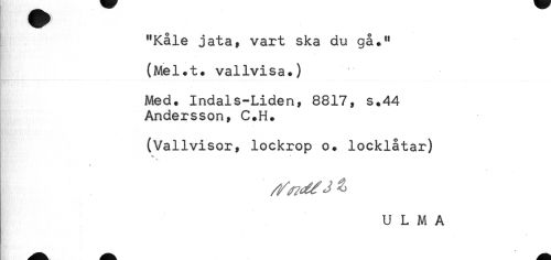 //// E - < HHP^ //// "Kåle jata, vart ska du gå." //// - //// (Mel.t. vallvisa.) //// Med. Indals-Liden, 8817, s.44 //// Andersson, C.H. //// (Vallvisor, lockrop o. locklåtar) //// * ////