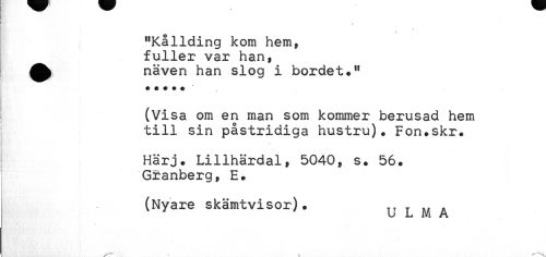 //// B/* //// t //// < //// "Kallding kom hem, //// fuller var han, //// näven han slog i bordet." //// i (Visa om en man som kommer berusad hem //// till sin påstridiga hustru). Fon.skr* //// Härj. Lillhärdal, 5040, s. 56. //// Granberg, E. //// (Nyare skämtvisor). ,, T ^ A //// ^ U L M A ////