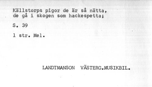 //// Källstorps pigor de är så nätta, //// de gå i skogen som hackespetta; //// S. 39 //// 1 str. Mel. //// LANDTMANSON VÄSTERG.MUSIKBIL. ////
