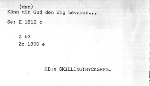 //// (den) //// Känn din Gud den dig bevarar... //// Se: E 1812 c //// //// /Z b3 //// Zz 1800 e //// t //// KB:s SKILLINGTRYCKSREG. ^ //// L ////