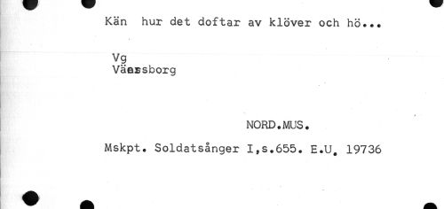 //// t'-.'*" //// Kän hur det doftar av klöver och hö... //// t //// Vg //// Väassborg //// NORD.MUS. //// Mskpt. Soldatsånger I,s.655. E.U. 19736 //// B? i ////