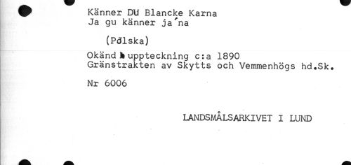 //// ^ Känner DU Blancke Karna //// Ja gu känner ja'na //// (Pdlska) //// Okänd!* uppteckning c:a 1890 //// Gränstrakten av Skytts och Vemmenhögs hd.Sk. //// Nr 6006 //// LANDSMÅLSARKIVET I LUND ////