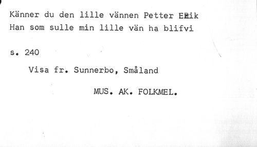 //// Känner du den lille vännen Petter ERik //// Han som sulle min lille vän ha blifvi //// s. 240 //// Visa fr. Sunnerbo, Småland //// MUS. AK. FOLKMEL. //// <t ////