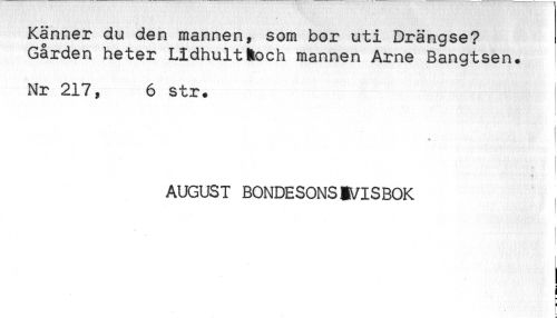 //// Känner du den mannen, som bor uti Drängse? //// Gården heter LIdhulthoch mannen Arne Bangtsen. //// Nr 217, 6 str. j //// i //// * ] //// i //// AUGUST BONDESONSEVISBOK //// ! //// - //// ) ////