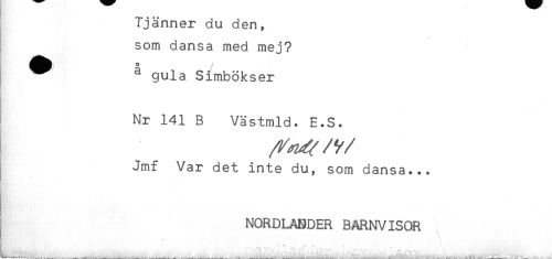//// Tjänner du den, //// som dansa med mej? //// gf {åjjjjjj)^ <* //// /^ ^ gula Simbökser //// Nr 141 B Västmld. E.S. //// Jmf Var det inte du, som dansa... //// NORDLABDER BARNVISOR //// ' ' ' -mtL^^L. é ... <...... ////