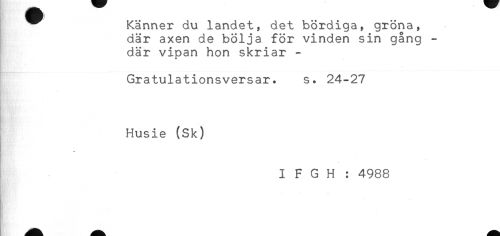 //// ^^ Känner du landet, det bördiga, gröna, //// där axen de bölja för vinden sin gång - //// där vipan hon skriar - //// Gratulationsversar. s. 24-27 //// Husie (Sk) //// - //// I F G H : 4988 ////