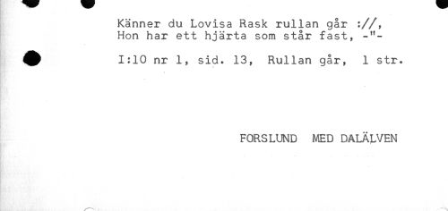 //// Känner du Lovisa Rask rullan går ://, //// Hon har ett hjärta som står fast, -"- //// ^^ 1:10 nr 1, sid. 13, Rullan går, 1 str. //// . //// FORSLUND MED DALÄLVEN ////