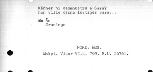 //// Känner ni gammhustru a Sara? //// hon ville gärna lustiger vara... //// Mn Ån //// Graninge //// NORD. MUS. //// ^ Mskpt. Visor VI.s. 709. E.U. 25761. ////